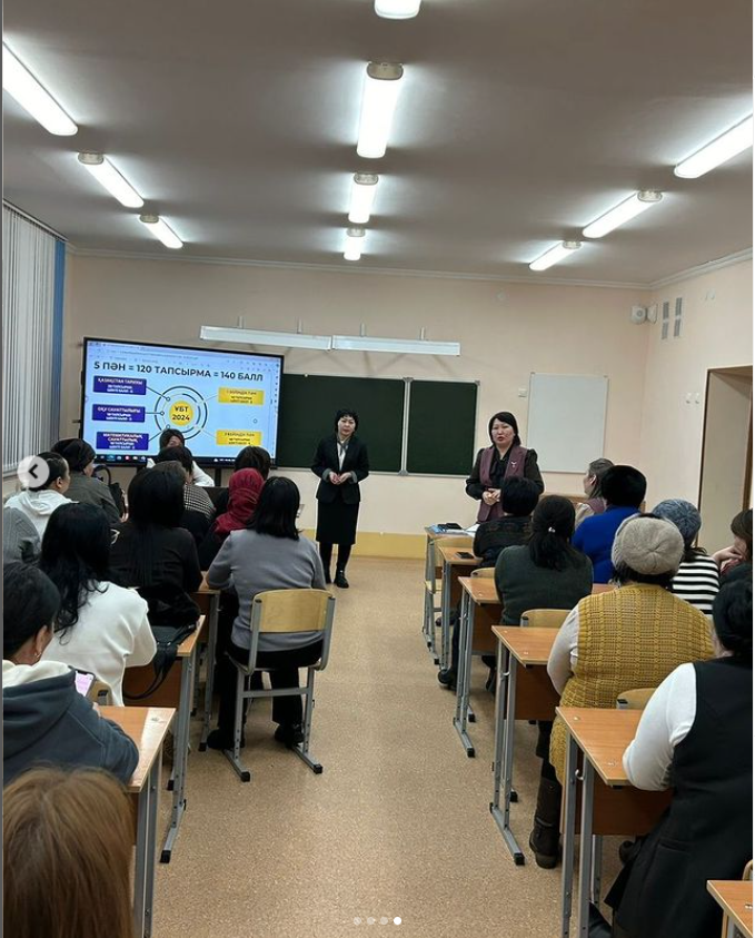 ДОІЖО А.М.Нуркамбаева 11- сынып оқушылары үшін маңызды міндет – ҰБТ-ға дайындық, оны тапсыру болып табылатындығын және жасөспірімдердің тыныштығы, сенімділігі, психологиялық тұрақтылығының ресурсы ең алдымен олардың ата-анасына байланысты екендігіне тоқталды. 2024 жылғы ҰБТ- ның форматымен ата -аналарды таныстырып өтті.Әрбір ата-ана түсінуі тиіс: ҰБТ нәтижесінің маңыздылығы олардың баланың денсаулығы мен эмоционалдық саулығына алаңдаушылығынан басым болмауы керектігі ескертілді. ҰБТ-ның өткізілу тәртібімен таныстыра отырып, жан-жақты мағлұмат берілді.